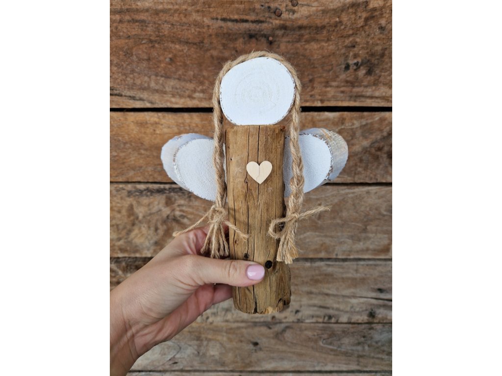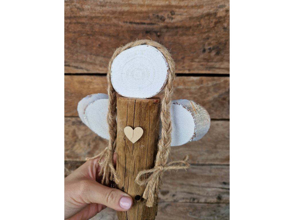 Andělka Miluška je opravdový poklad. Je milá, milující a zajisté bude ve svém novém domově také milována. I přes prasklinku na dřevěném srdíčku způsobenou stále pracujícím dřevem, vám domů přinese hromadu lásky a přispěje k útulné domácí atmosféře. Celá je ručně vyrobena ze dřeva, až na vlásky, ty má pletené z přírodního provázku. Andělka se hodí jako celoroční přírodní dekorace, ať už ji umístíte kamkoli.
