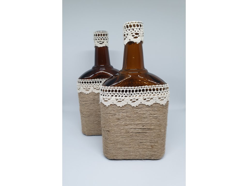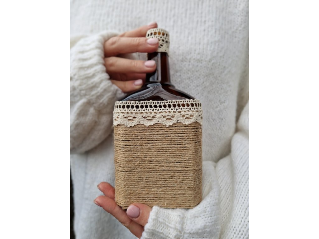 I prostá sklenice může být neobyčejná. Tato lahev neobvyklého tvaru se přímo vybízí k tomu, aby byla nazdobena a udělala někomu radost, například vaší babičce. Sklenici jsem omotala přírodním provázkem a dozdobila dekorativní krajkou. Takto ručně nazdobenou sklenici je možné využít jako vázičku na sušené kvítí či jako pouhou dekoraci ve stylu boho.