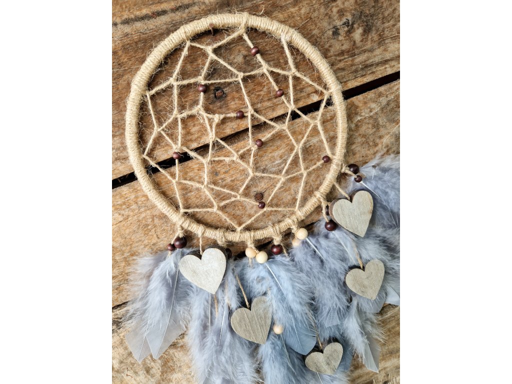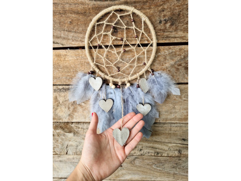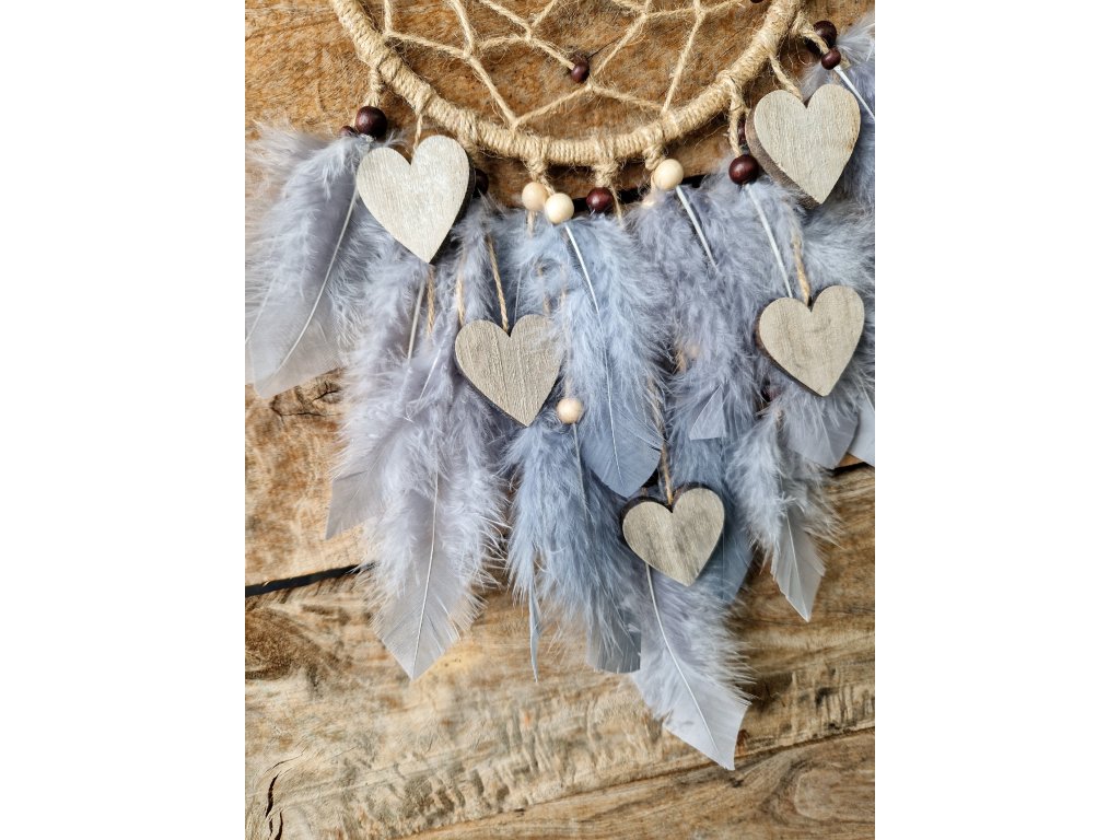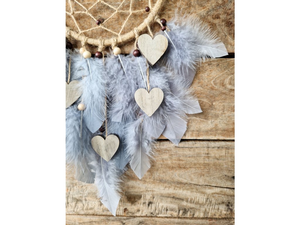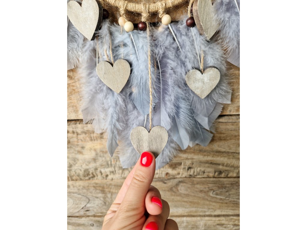 Krásný lapač snů laděný do šedé barvy jsem vytvořila z dřevěného podkladu omotaného přírodním provázkem, šedých pírek a dřevěných korálků. Je dozdoben šedými srdíčky ze dřeva.